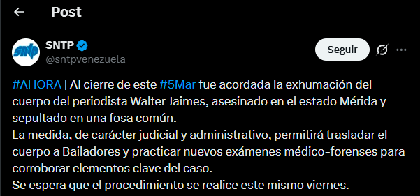 El Sindicato Nacional de Trabajadores de la Prensa de Venezuela (Sntp) informó la noche de este jueves 5 de marzo que fue acordada la exhumación del cuerpo del periodista venezolano Walter Alexander Jaimes, asesinado recientemente en el estado Mérida.