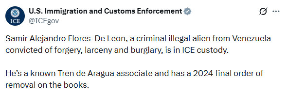 Se trata de Samir Alejandro Flores De León, quien, como señaló este viernes 24 de abril en X, es un “condenado por falsificación, hurto y robo con allanamiento de morada” que “se encuentra bajo custodia del ICE”.
