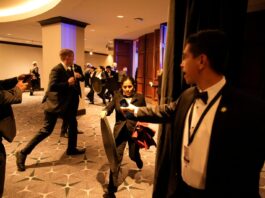 Enseguida, todos los ocupantes de la mesa presidencial fueron evacuados a lugar seguro y después más miembros del Servicio Secreto se desplegaron en la sala de baile portando rifles de asalto y pidieron a todas las personas en la sala que se pusieran a cubierto.
