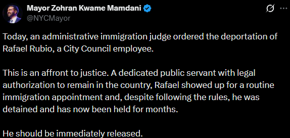 «Hoy, un juez administrativo de inmigración ordenó la deportación de Rafael Rubio, empleado del Ayuntamiento. Esto es una afrenta a la justicia. Rafael, un funcionario público ejemplar con autorización legal para permanecer en el país, se presentó a una cita rutinaria de inmigración y, a pesar de haber seguido las normas, fue detenido y lleva meses retenido. Debe ser puesto en libertad inmediatamente», exigió Mamdani en una publicación en X.