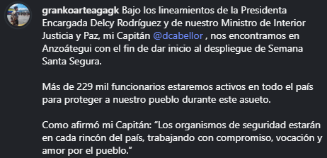 «Bajo los lineamientos de la presidenta Encargada Delcy Rodríguez y de nuestro ministro de Interior Justicia y Paz, mi Capitán Diosdado Cabello, nos encontramos en Anzoátegui con el fin de dar inicio al despliegue de Semana Santa Segura», comentó Granko en su cuenta de Instagram.