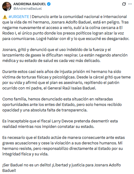 Andreina Baduel denunció en X que la vida de su hermano, el preso político Josnars Adolfo Baduel, está en peligro en la cárcel de El Rodeo I.