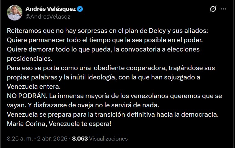 A través de su cuenta en X, Velásquez sostuvo que la estrategia del chavismo pasa por “demorar todo lo que pueda” el llamado a unos comicios, mientras intenta proyectar una imagen de cooperación dentro del proceso político que atraviesa Venezuela.
