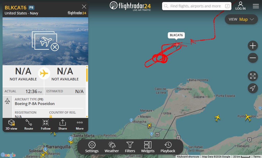 El segundo equipo aéreo involucrado voló con el indicativo BLKCAT6, correspondiente a un dron de vigilancia MQ-4C Triton de la Armada de EEUU. Este vehículo no tripulado ejecuta misiones de reconocimiento e inteligencia a gran altitud para monitorear las telecomunicaciones y la actividad naval en la zona caribeña.