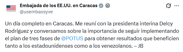 El representante diplomático compartió los primeros detalles de la reunión a través de la cuenta oficial de la Embajada estadounidense en la red social X. «Un día completo en Caracas», indicó el funcionario para describir su jornada de trabajo en la capital venezolana.