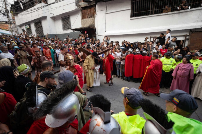 AME261. CARACAS (VENEZUELA), 03/04/2026.- Personas participan en la dramatización del viacrusis de Semana Santa este viernes, en Caracas (Venezuela). Miles de personas acompañaron en el barrio caraqueño de Petare, considerado la favela más grande de Venezuela, la tradicional representación del viacrucis que jóvenes y líderes religiosos han organizado durante 40 años. EFE/ Ronald Peña RAME266. CARACAS (VENEZUELA), 03/04/2026.- Personas participan en la dramatización del viacrusis de Semana Santa este viernes, en Caracas (Venezuela). Miles de personas acompañaron en el barrio caraqueño de Petare, considerado la favela más grande de Venezuela, la tradicional representación del viacrucis que jóvenes y líderes religiosos han organizado durante 40 años. EFE/ Ronald Peña R