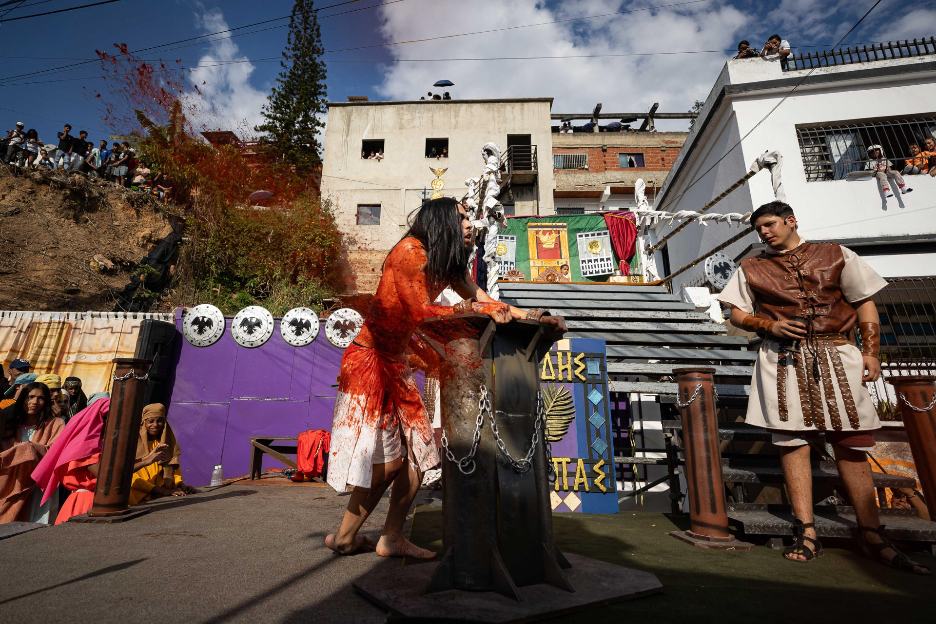 AME261. CARACAS (VENEZUELA), 03/04/2026.- Personas participan en la dramatización del viacrusis de Semana Santa este viernes, en Caracas (Venezuela). Miles de personas acompañaron en el barrio caraqueño de Petare, considerado la favela más grande de Venezuela, la tradicional representación del viacrucis que jóvenes y líderes religiosos han organizado durante 40 años. EFE/ Ronald Peña RAME266. CARACAS (VENEZUELA), 03/04/2026.- Personas participan en la dramatización del viacrusis de Semana Santa este viernes, en Caracas (Venezuela). Miles de personas acompañaron en el barrio caraqueño de Petare, considerado la favela más grande de Venezuela, la tradicional representación del viacrucis que jóvenes y líderes religiosos han organizado durante 40 años. EFE/ Ronald Peña R