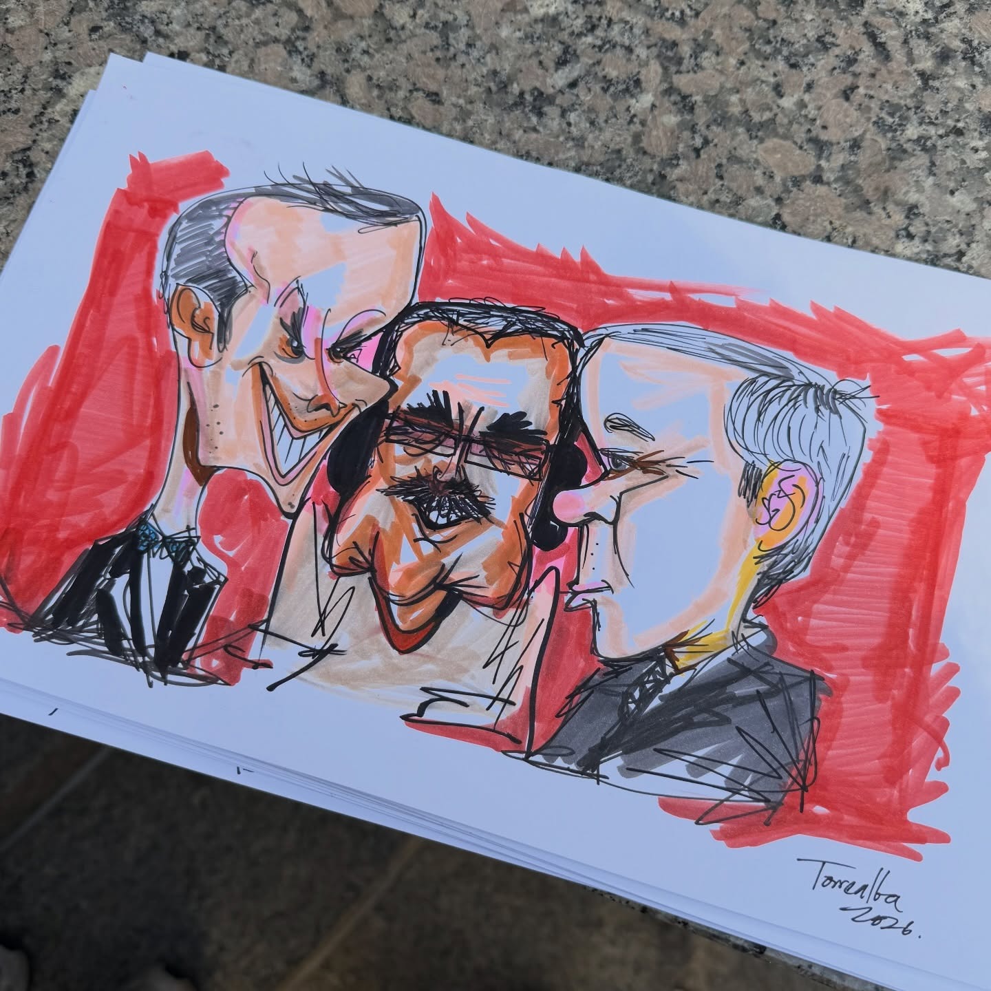El ilustrador venezolano Jorge Torrealba retrató al exmandatario Nicolás Maduro a través de varias caricaturas durante su reciente comparecencia ante un tribunal en Estados Unidos. La pieza gráfica capturó el momento judicial con el estilo satírico característico del dibujante criollo.