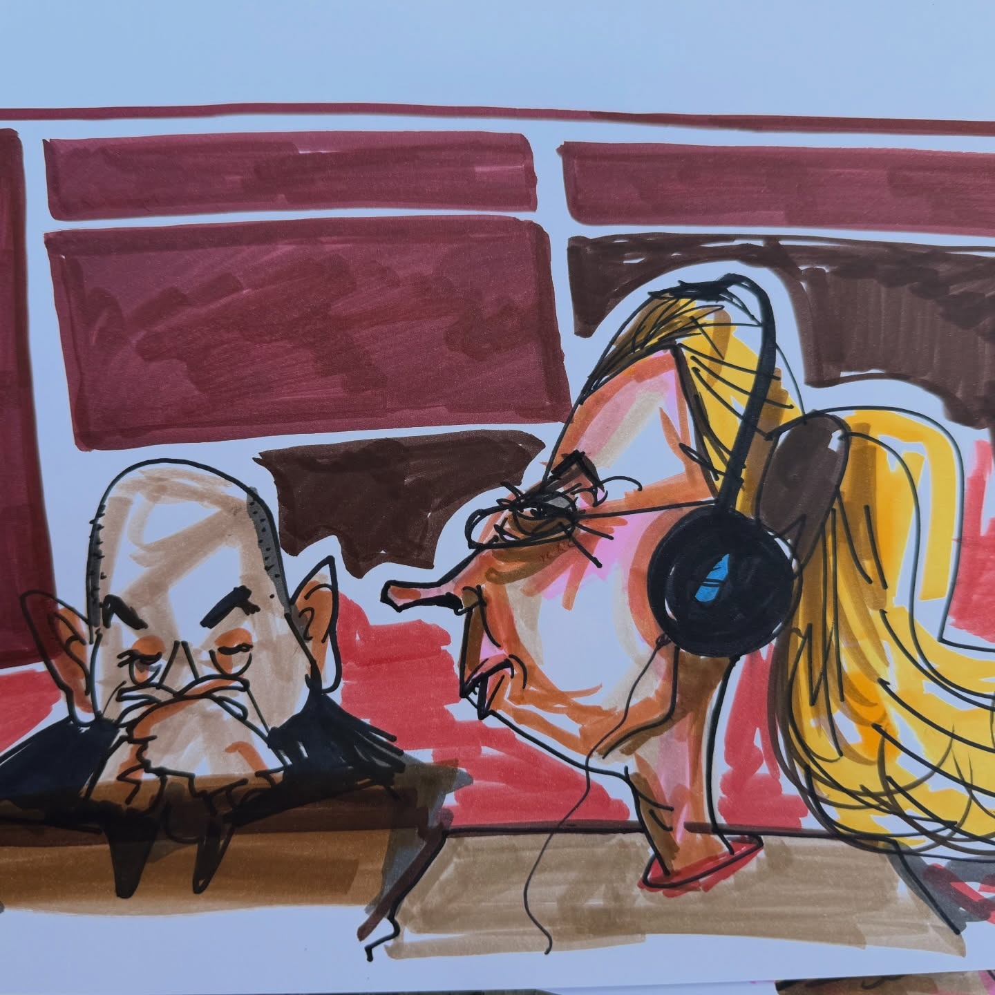 Una segunda ilustración de Torrealba proporciona una perspectiva diferente de la sala del tribunal. Esta pieza captura la escena desde detrás de Maduro y Flores que miran hacia un estrado más alto. Ambas figuras, de espaldas, llevan puestos auriculares negros grandes, idénticos a los utilizados en la primera caricatura para la traducción. Ambas miran hacia arriba al juez Hellerstein que preside con gafas redondas y una expresión concentrada. Detrás del primer personaje, se distingue una bandera de Estados Unidos.