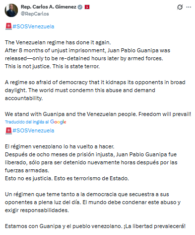 El congresista estadounidense Carlos Giménez condenó a desaparición forzada de Juan Pablo Guanipa, ocurrida apenas horas después de haber sido excarcelado el domingo.