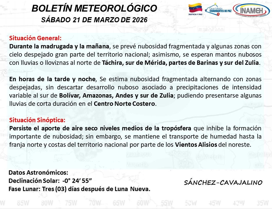 El Instituto Nacional de Meteorología e Hidrología (Inameh) informó que para este sábado 21 de marzo, Venezuela amanece con nubosidad fragmentada y algunas zonas despejadas en buena parte del territorio nacional.