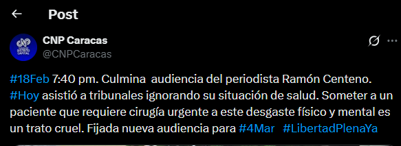 La Seccional Distrito Capital del Colegio Nacional de Periodistas de Venezuela (CNP) informó en su cuenta oficial de X la culminación este miércoles 18 de febrero de 2026 de una audiencia judicial del periodista Ramón Centeno, sin que se dictara una decisión definitiva sobre su caso.