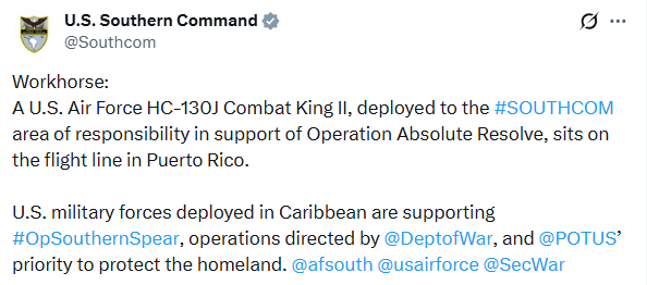 «Caballo de batalla: Un HC-130J Combat King II de la Fuerza Aérea de EEUU, desplegado en el área de responsabilidad del Comando Sur en apoyo a la Operación Resolución Absoluta, se encuentra en la línea de vuelo en Puerto Rico», indicó la cuenta oficial de X del organismo castrense.