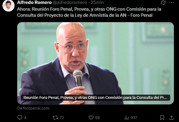 Alfredo Romero, abogado y Director Presidente del Foro Penal, confirmó este sábado 7 de febrero a través de su cuenta oficial de X la realización de un encuentro entre la Comisión Especial para la Promoción de la Consulta del Proyecto de Ley de Amnistía para la Convivencia Democrática y varias organizaciones de la sociedad civil, defensoras de DDHH.