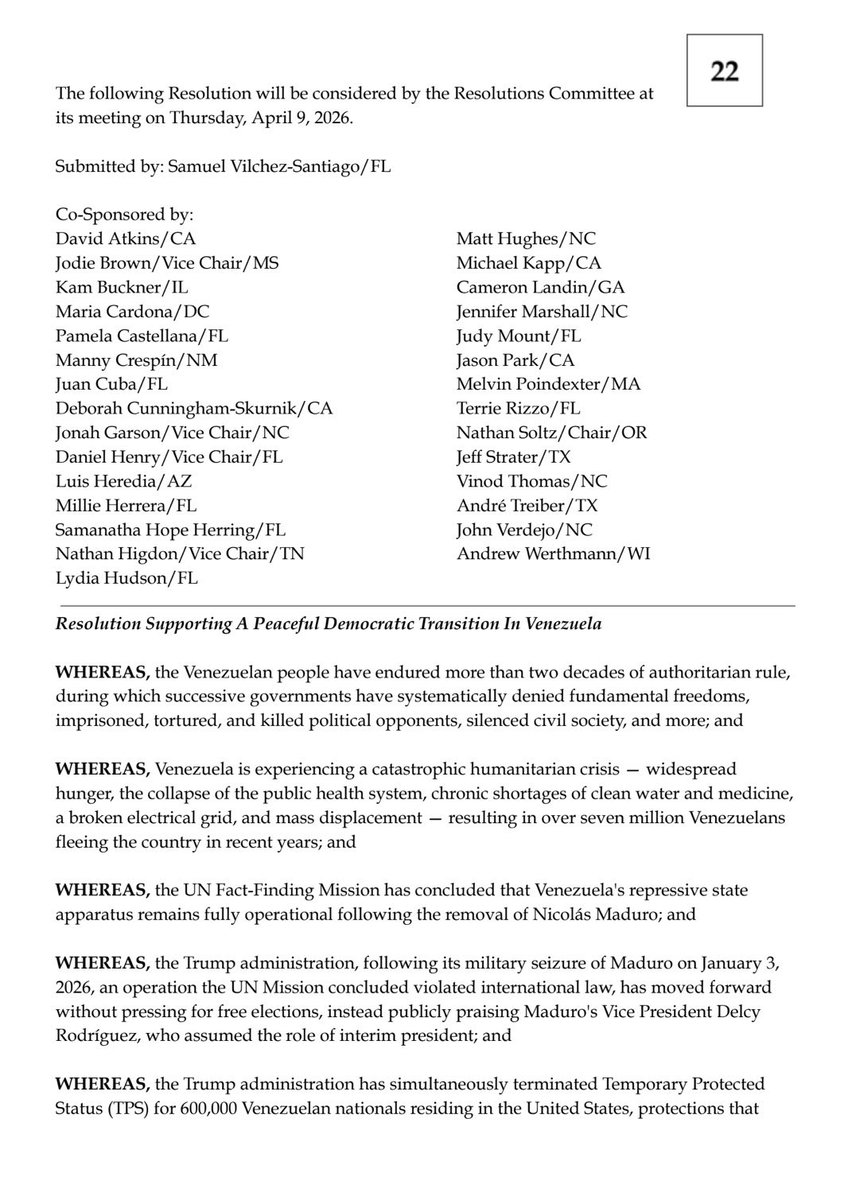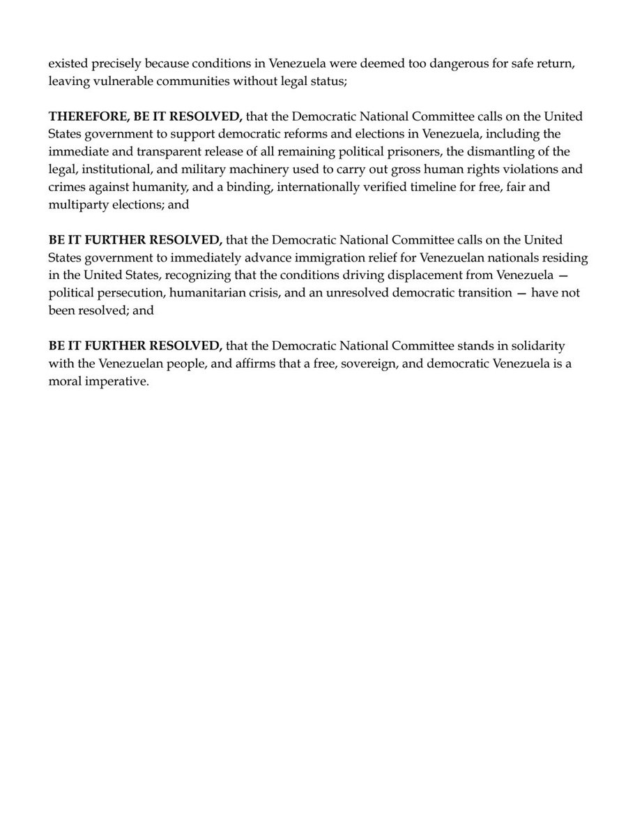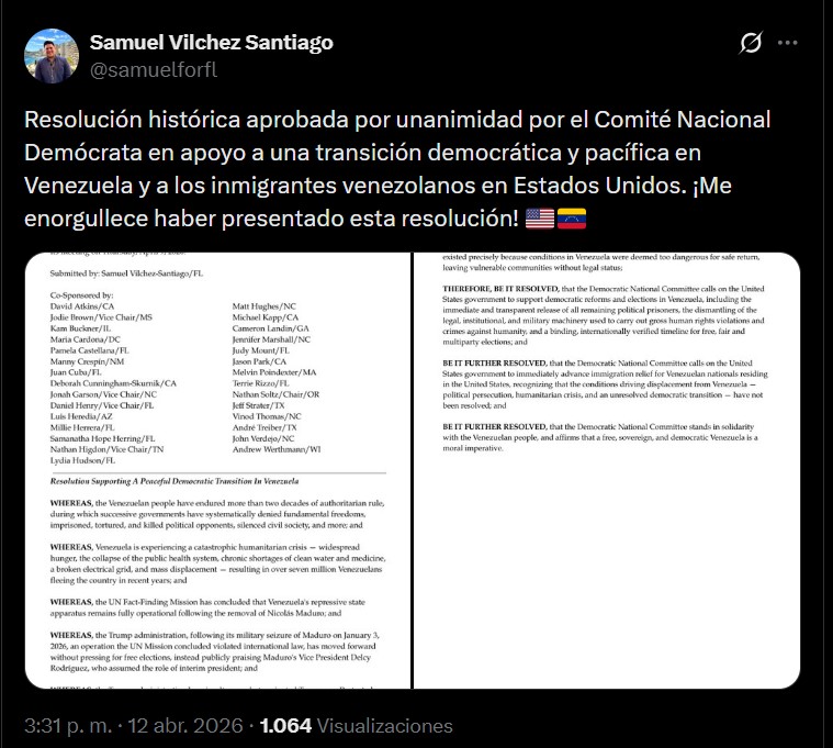 La resolución fue aprobada de forma unánime como parte de una iniciativa liderada por el dirigente venezolano-americano Samuel Vilchez Santiago, miembro del DNC y candidato legislativo estatal por Florida en representación del Partido Demócrata. El dirigente impulsó el texto para combinar el respaldo a una salida institucional en Venezuela con garantías para los migrantes venezolanos en EEUU.