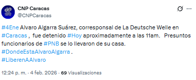 El Colegio Nacional de Periodistas (CNP) denunció a través de su cuenta en X la detención del periodista Álvaro Algarra Suárez, corresponsal de la cadena internacional alemana Deutsche Welle (DW) en Caracas.