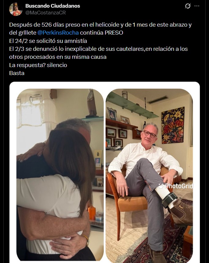 Perkins Rocha sigue bajo arresto domiciliario y con un grillete electrónico, según denunció este domingo su esposa, María Constanza Cipriani, quien recordó que el abogado permanece privado de libertad y con grillete electónico pese a haber solicitado la amnistía.