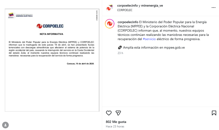 Corpoelec emitió comunicado para justificar el apagón que afectó gran parte del estado Zulia, atribuyendo el fallo a las «lluvias torrenciales con descargas atmosféricas» registradas la madrugada del jueves 16 de abril de 2026.