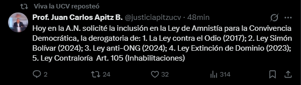 El decano de la Facultad de Ciencias Jurídicas y Políticas de la Universidad Central de Venezuela (UCV), Juan Carlos Apitz, informó que solicitó ante la Asamblea Nacional chavista la inclusión de la derogatoria de varias leyes dentro de la Ley de Amnistía para la «Convivencia Democrática».