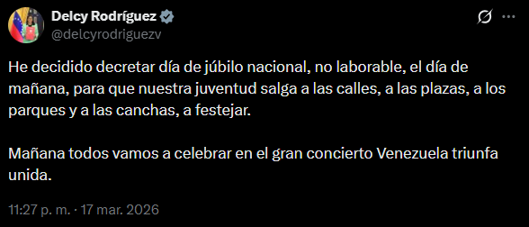 Delcy Rodríguez declaró día de júbilo nacional no laborable para el miércoles 18 de marzo. La sucesora de Nicolás Maduro comunicó la decisión a través de su cuenta en la red social X como respuesta al reciente campeonato obtenido por la selección venezolana en el Clásico Mundial de Béisbol.