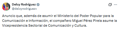 «Anuncio que, además de asumir el Ministerio del Poder Popular para la Comunicación e Información, el compañero Miguel Pérez Pirela asume la Vicepresidencia Sectorial de Comunicación y Cultura», se lee en el mensaje de Rodríguez en X.