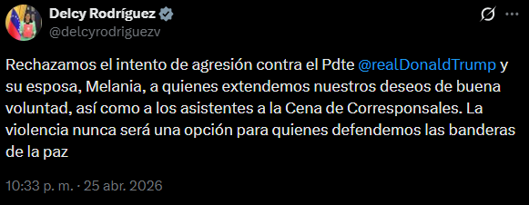 A través de su cuenta en X, Delcy Rodríguez, utilizó el idioma del «imperio» para rechazar el asalto armado ocurrido durante la cena anual de corresponsales de la Casa Blanca. El aparato de propaganda extendió sus «deseos de buena voluntad» tanto al mandatario norteamericano como a la primera dama, Melania Trump.