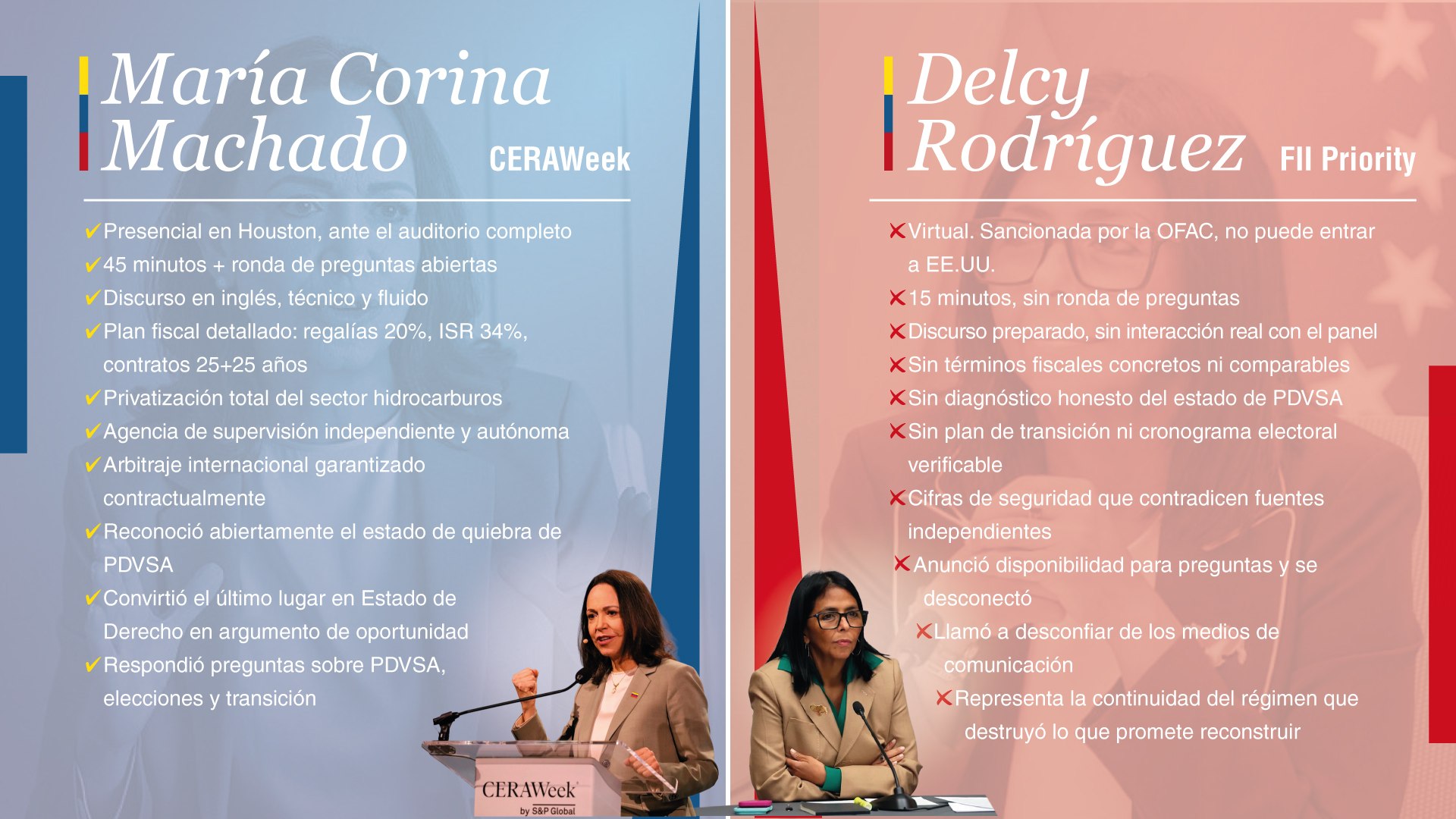 A veces la historia tiene buen sentido del tiempo. En menos de 24 horas, y sin que nadie lo hubiera planeado así, el mundo de las inversiones energéticas pudo ver cara a cara las dos propuestas de Venezuela: la de una lideresa en Houston, presente en el escenario, respondiendo preguntas en inglés ante las empresas más poderosas del sector; y la de una funcionaria en Miami que apareció en pantalla durante 15 minutos, leyó sus cifras, anunció que estaba «a la disposición para las preguntas» y se desconectó.
