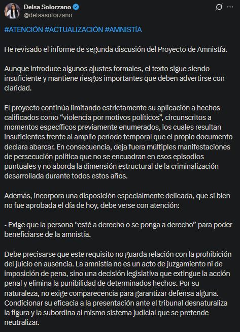 A través de una publicación en su cuenta de X, Solórzano explicó que, aunque el nuevo informe introduce ajustes formales, el texto sigue siendo “insuficiente” y conserva «riesgos importantes» que deben ser considerados. Además, señaló que el proyecto restringe su aplicación a hechos calificados como “violencia por motivos políticos” en momentos específicos previamente enumerados, lo que —a su juicio— excluye múltiples manifestaciones de persecución desarrolladas durante años.