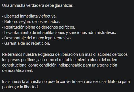 “La amnistía no puede convertirse en una excusa dilatoria para postergar la libertad”, afirmó, al reiterar su exigencia de liberación sin más demoras de todos los presos políticos y el restablecimiento pleno del orden constitucional.