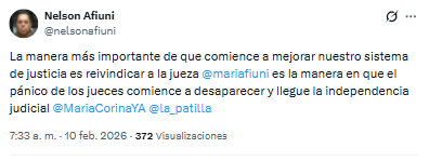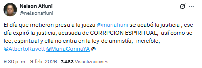 En su mensaje, calificó de «increíble» el proceso judicial en contra de la magistrada, recordando que fue señalada bajo la figura de «corrupción espiritual» y denunciando que, pese al tiempo transcurrido, ella no sería amparada en los beneficios de la ley de amnistía.