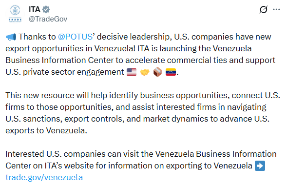 La Administración de Comercio Internacional de Estados Unidos anunció este viernes 24 de abril la creación del «Centro de Información Empresarial de Venezuela» para facilitar la participación del sector privado norteamericano en el mercado venezolano.