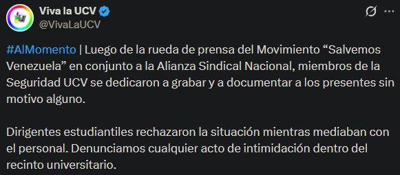 “Denunciamos cualquier acto de intimidación dentro del recinto universitario”, escribió Viva la UCV.