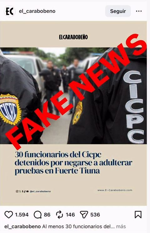 «Se informa a la colectividad la información que circula a través de diversas plataformas digitales y mensajería instantánea sobre la presunta detención de 30 funcionarios del Cicpc, es TOTALMENTE FALSA. No existe ningún procedimiento que involucre la detención de tal cantidad de funcionarios», comentó Rico en sus redes sociales.