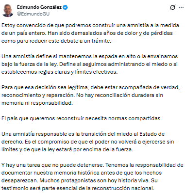 El presidente electo de Venezuela, Edmundo González Urrutia, consideró este viernes que «no hay reconciliación duradera sin memoria ni responsabilidad», luego de que la Asamblea Nacional chavista aprobara la ley de amnistía que ha generado dudas y críticas sobre sus implicaciones para la justicia y la verdadera reconciliación en el país.