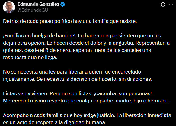 «Detrás de cada preso político hay una familia que resiste. ¡Familias en huelga de hambre! Lo hacen porque sienten que no les dejan otra opción. Lo hacen desde el dolor y la angustia», exclamó González en una publicación en redes sociales.
