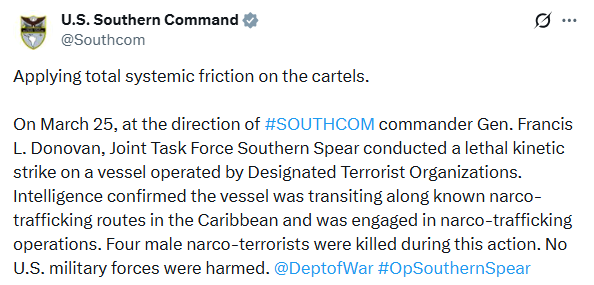 El Comando Sur de Estados Unidos ejecutó un ataque letal contra una narcolancha en el mar Caribe este miércoles 25 de marzo, una operación militar que dejó un saldo de cuatro hombres fallecidos.