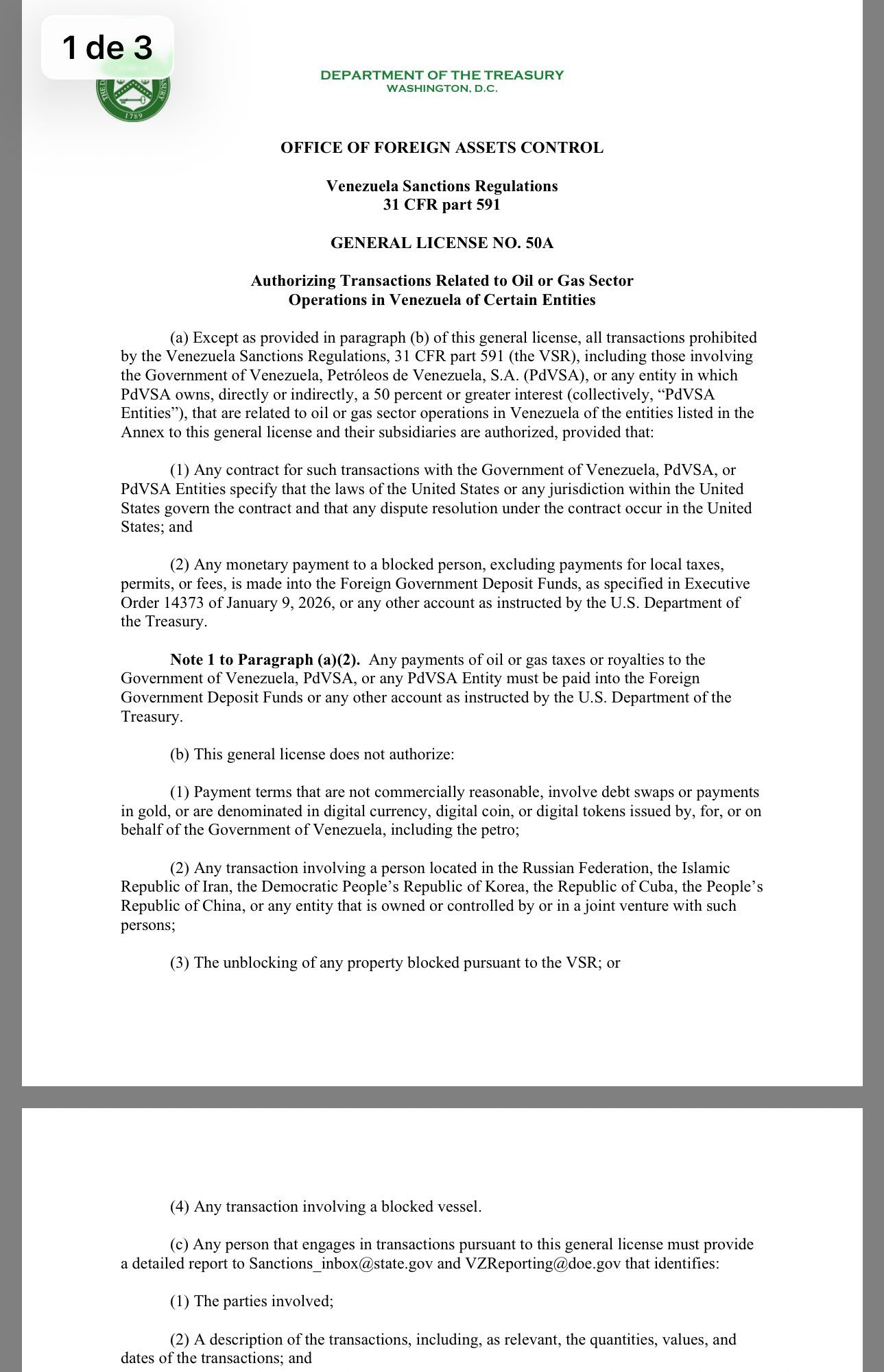 Las preguntas frecuentes se refieren a dos autorizaciones, conocidas como licencias generales, que el Departamento del Tesoro emitió el 10 de febrero. Una levantó las sanciones estadounidenses a la exportación, venta, almacenamiento y transporte de petróleo venezolano. La otra autorizó el suministro de bienes, tecnología, software o servicios estadounidenses para la exploración, el desarrollo o la producción de petróleo y gas en Venezuela.