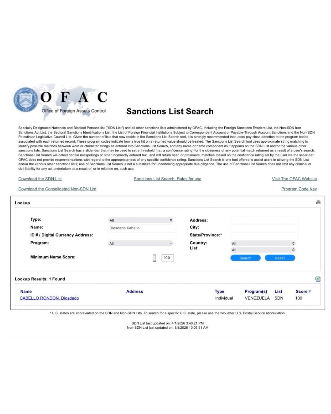 Como se observa en el registro oficial de la OFAC (actualizado a fecha de hoy): Nombre: CABELLO RONDON, Diosdado. Estatus: Sigue en la Lista SDN. Puntaje de coincidencia (Score): 100%. Programa: VENEZUELA.