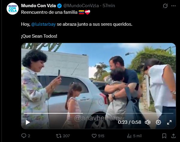 La cuenta oficial de Mundo Con Vzla celebró el acontecimiento con un mensaje: «Reencuentro de una familia. Hoy, @luistarbay se abraza junto a sus seres queridos. ¡Que Sean Todos!».