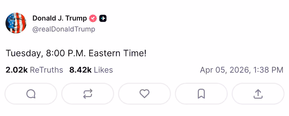 El presidente estadounidense Donald Trump pareció extender el domingo el plazo que le había impuesto a Irán para que llegara a un acuerdo para reabrir el estrecho de Ormuz o, de lo contrario, enfrentaría un bombardeo devastador. Publicó un mensaje que simplemente decía: “¡Martes, 8:00 p. m., hora del este!”.