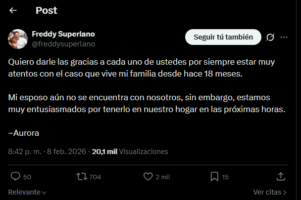 Aurora, esposa del dirigente opositor Freddy Superlano, publicó la noche de este domingo 8 de febrero, un mensaje en el que agradeció el respaldo recibido durante los últimos 18 meses y expresó su entusiasmo ante la posibilidad de que su esposo regrese a casa en las próximas horas.