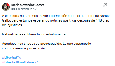 Sin embargo, manifestó que se mantienen a la espera de «noticias positivas» que pongan fin a los 448 días de injusticias.