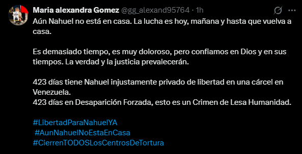 “Aún Nahuel no está en casa. La lucha es hoy, mañana y hasta que vuelva a casa. Es demasiado tiempo, es muy doloroso, pero confiamos en Dios y en sus tiempos. La verdad y la justicia prevalecerán”, manifestó María Gómez en su cuenta de X.