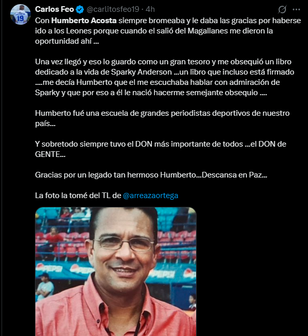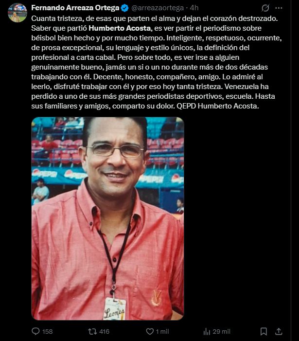 La muerte de Humberto Acosta representa una pérdida significativa para el periodismo venezolano y, en especial, para la crónica deportiva. Su obra, plasmada en columnas, transmisiones y recuerdos compartidos por colegas y aficionados, permanecerá como testimonio de una vida dedicada al béisbol y a la narración deportiva.