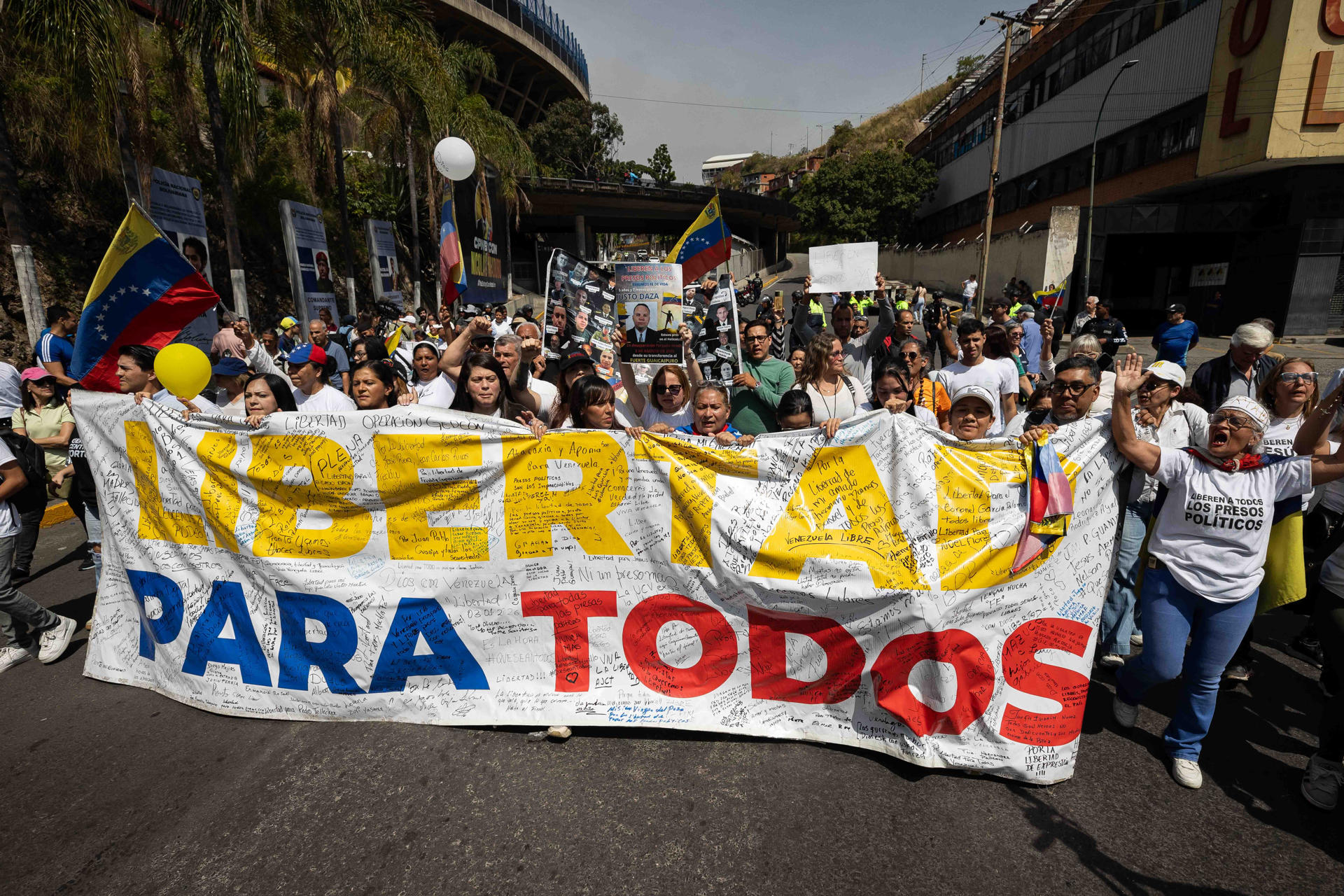 Frente a la puerta de El Helicoide -que calificaron como «un centro de torturas» y pidieron se cierre y se convierta en un museo de la memoria de la «represión»-, desplegaron pancartas con fotografías de presos políticos y mensajes de «Libertad», mientras coreaban consignas y ondeaban banderas de Venezuela.