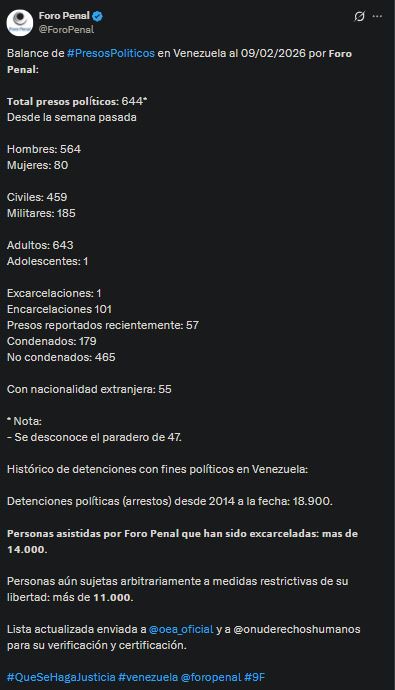 La ONG Foro Penal actualizó este viernes el balance de los presos políticos en Venezuela, con corte al 9 de febrero de 2026, luego de las excarcelaciones registradas en los últimos días.