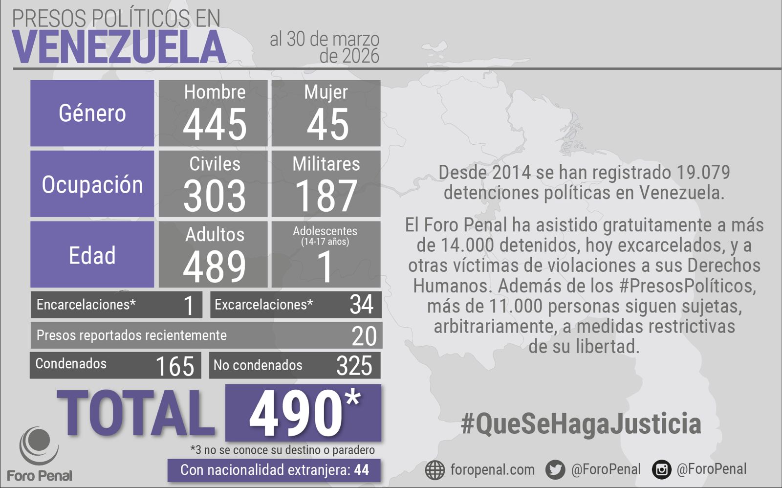 Según el Foro Penal, actualmente en Venezuela hay al menos 490 presos políticos: 445 hombres, 45 mujeres, 303 civiles, 187 militares, 489 adultos, y un adolescente.