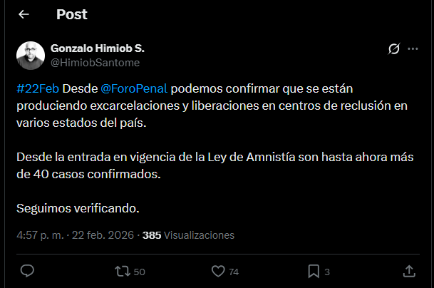 “Desde Foro Penal podemos confirmar que se están produciendo excarcelaciones y liberaciones en centros de reclusión en varios estados del país. Desde la entrada en vigencia de la Ley de Amnistía son hasta ahora más de 40 casos confirmados. Seguimos verificando”, escribió.