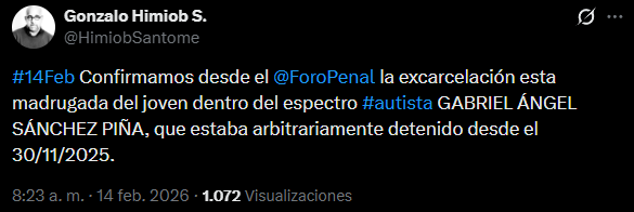 «Confirmamos desde el Foro Penal la excarcelación esta madrugada del joven dentro del espectro autista GABRIEL ÁNGEL SÁNCHEZ PIÑA, que estaba arbitrariamente detenido desde el 30 de noviembre de 2025», informó en redes sociales Gonzalo Himiob, director vicepresidente de la mencionada ONG.