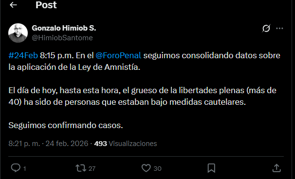 El abogado y vicepresidente de la ONG Foro Penal, Gonzalo Himiob, informó la noche de este martes 24 de febrero que la organización continúa consolidando datos sobre la aplicación de la Ley de Amnistía en Venezuela.